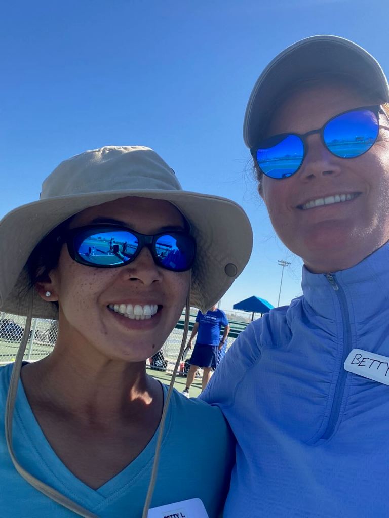 While Brian golfed I had the good fortune to attend a two day pickleball camp by LevelUp which was held at the gorgeous Bell Bank sports park in Mesa. The park has 40 individually fenced pickleball courts and a covered center court for tournaments. Below is a shot of Betty with one of the camp pros, Betty Jane.