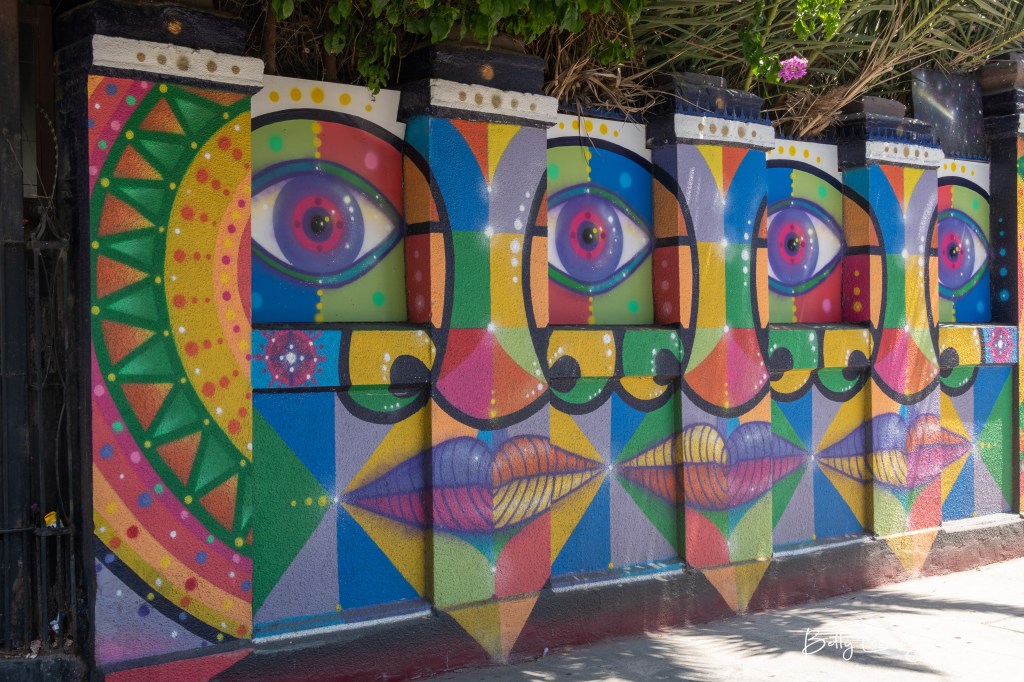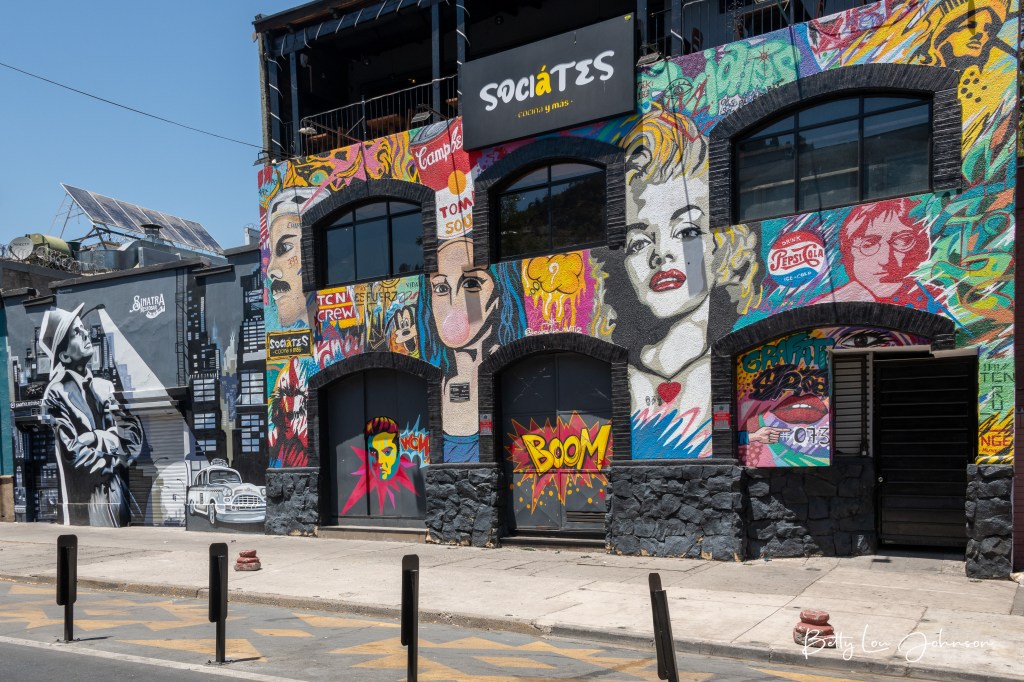 Santiago, the capital and largest city of Chile, faces the Andes Mountains to the east. It’s cosmopolitan and enjoyable. The city is well established with tree lined streets and a mix of old and new architecture. Murals are everywhere you look, everywhere. We stayed in the Vitacura area, our favorite, and found the shops and restaurants over the top. We liked walking to dinner from our hotel around 8 pm after temperature dropped. Simple and charming.