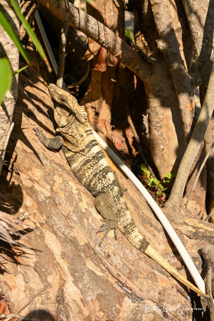 One afternoon we spent time on Half Moon Caye. We dropped off the kitchen crew who cooked bbq and set up picnic camp while divers and snorkelers took a dive. We came back for lunch and hiking. This was a special place where there are nurse sharks swimming a couple feet off the beach. You can take a short hike to a watch tower where you view the bountiful nests of red-footed booby birds and their hatchlings. The frigate birds are also nearby, harassing the red-footed boobies for food.