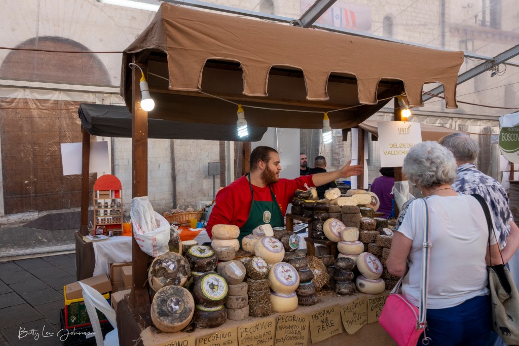 While in Umbria we again made day trips to local towns, favoring small villages. We delighted in local delicacies: truffles, pecorino cheese, olives, Sangiovese grapes(liquid form). We consumed pasta twirled in a hollowed-out pecorino wheel. What a presentation of a tasty meal.